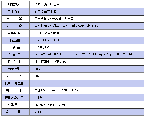 儀器符合GB/T7600及采用卡爾—費(fèi)休法測定樣品中水分的有關(guān)標(biāo)準(zhǔn),適用于石油化工產(chǎn)品、充油電器設(shè)備絕緣油及礦物原料等物質(zhì)中水分的測定。 該儀器采用了大屏幕彩色液晶顯示,中文菜單,人機(jī)對話更直觀,操作更簡便,具有自動換算自動打印和保存測定結(jié)果等功能,與同類儀器相比,大大提高了測試靈敏度。